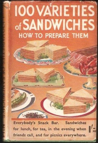 | WOODMAN, Mary. 100 Varieties of Sandwiches. c.1940. [12802] First Edition. Foulshams Pocket Library, n.d. c.1940. Hardback, pocket sized 8vo. cloth, 92pp. some-time price on ffep, contents clean and tight in worn and slightly chipped d.w. Scarce. Sandwiches both savoury and sweet in listed alphabetical order with a chapter of recipes for breads, scones and biscuits. Some unusual ideas. £25.00 | |