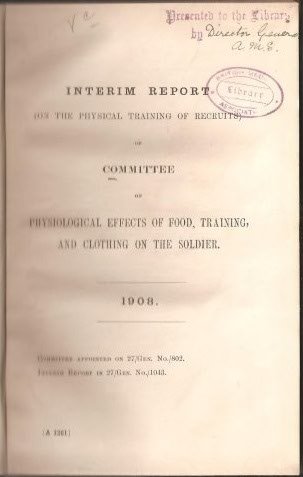 | SOLDIERS. Interim Report on the Physiological Effects on Food, Training, and Clothing on the Soldier. War Office, 1908. [6313] 1908. Hardback, 8vo. cloth, British Medical Association Library stamp on a few pp. else a clean tight copy. With, amongst others, reports on the Analysis of Tinned Meats as Supplied to the Army; Notes on Rations of Different Armies. £35.00 | |
