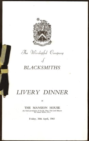 | MENU. Worshipful Company of Blacksmiths Livery Dinner at The Mansion House. Friday, 30th. April, 1965. [11630] Folding card 21x12.5cm. 4pp. insert and folding Table Plan printed in black. Condition excellent with no marks or defects. With original black and yellow ribbon. Bill of Fare consisting of Clear Turtle, Scotch Salmon, Saddle of Lamb, Norfolk Asparagus, Oriental Fruit Salad. Wines listed. £10.00 | |