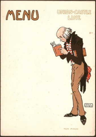 | MENU CARD. Union-Castle Line. c.1935. [11771] Card, 25.5x18cm. Some foxing else condition v.g. Unused card. Dicken's character Tom Pinch with illustration by Will Owen. £15.00 | |