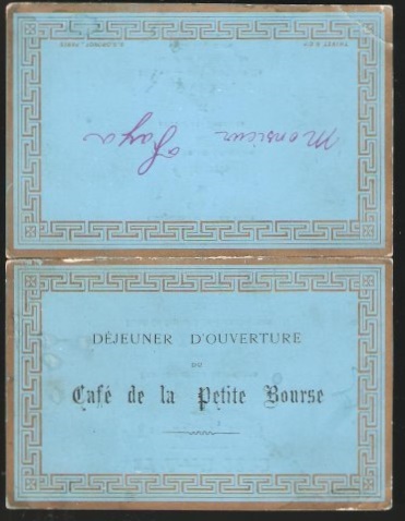 CARD Cafe de la Petite Bourse, Dejeuner DOuverture, Paris, 17 Avril, 1882.