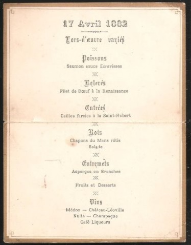 [13301] Folded gilt edged blue card with gilt greek key decoration 14.5x11mm. open. Card a little worn with tiny split at fold. Hors-doeuvre varies; Poisson: Sauce Ecrevisses; Releves: Filet de Boeuf a la Renaissance; Rots: Chapons du Mans rotis; Salade; Entremets: Asperges en Branches; Fruits et Desserts; Vins: Medoc - Chateau-Leoville; Nuits - Champagne; Cafe Liqueurs. £15.00 | |