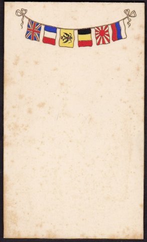 | MENU CARDS. Antique Menu Cards x 2. Triple Entente c.1907 [14729] Cards, 6.4 inches unused with decoration of the flags of six countries being: Japan, Russian Empire, France, Great Britain, Belgium, Russian Federation (?) possibly to celebrate the Triple Entente of 1907. Flags hanging on a gilt line with bows at each end. Both cards lightly foxed else very good. £20.00 | |