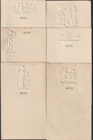 | MENU CARDS. Antique Menu Cards x 9. c.1910. [14732] Nine unused antique cards c.1910. Cream card 6.3x3.4 inches with embossed decorations of Roman antiqities, 6 designs and 3 duplicates. Condition very good. £25.00 | |