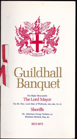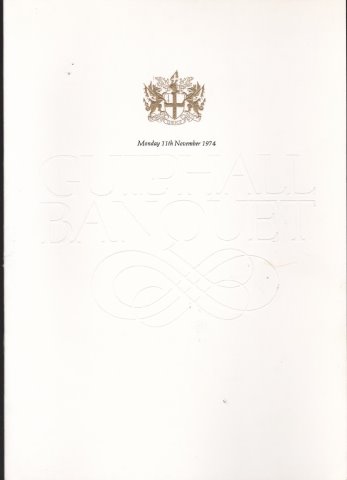 | MENU. Guildhall, London. Guildhall Banquet. The Lord Mayor, The Rt. Hon. Alderman Sir Murray Fox. Monday, November, 11th. 1974 [15560] Card folding, City of London Arms embossed in gold to front cover, embossed lettering, 4pp. insert. A couple of tiny marks to front else v.g. £12.50 | |