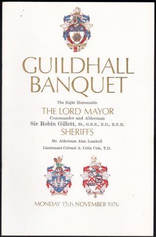 | MENU Guildhall, London. Guildhall Banquet. Lord Mayor Sir Robin Gillett. Monday, 15th, November, 1976 [15567] Cream folding card, coloured coats of arms, embossed gilt lettering, 4pp. insert, red and white silk tasselled braid. Near fine. £12.50 | |