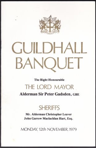 | MENU Guildhall, London. Guildhall Banquet. Lord Mayor Sir Peter Gadesdon. Guildhall, Monday 12th. November, 1979 [15570] Cream folding card City Arms heavily embossed in gilt, 4pp. insert. Very good to near fine. £12.50 | |
