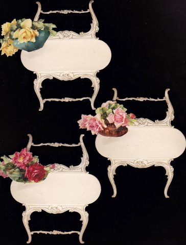 | PLACE CARDS. Antique Place Cards x 10. c.1920. [15840] Ten unused die cut freestanding place cards c.1920 comprising of a table (fold down the legs) on which sits a large bowl of roses. Three pink, three red, 4 yellow. Condition very good. £15.00 | |