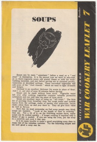 of Food. War Cookery Leaflet No.7. Soups. c.1941. [13319] Ministry of Food. Advice with ten recipes including Beetroot and Carrot and Pea Pod. One page folded, condition excellent. £5.00 | |