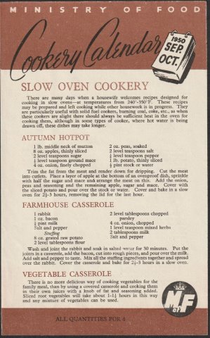 of Food. Cookery Calendar. Sept. Oct. 1950. [13328] Ministry of Food. Slow Oven Cookery. Recipes include Autumn Hotpot; Fisherman's Slice; Nutty Gingerbread. One leaf, condition very good. £5.00 | |