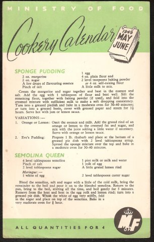 Ministry of Food. Cookery Calendar. Feb. Mar. 1951. [16126] Ministry of Food. One leaf, very light wear else condition very good. "These Dishes Will Bring Variety Into Your Menus." Royal Fish Pie, Brown Devonshire Apple Pudding and two others. £5.00 | |