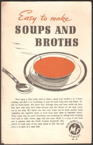 of Food. Leaflet No. 15. Easy to make Soups and Broths. 1946. 1946. [13732] Ministry of Food. 1946. One leaf folded in three, a couple of tiny spots else very good. Recipes for stock and mainly vegetable soups. £5.00 | |