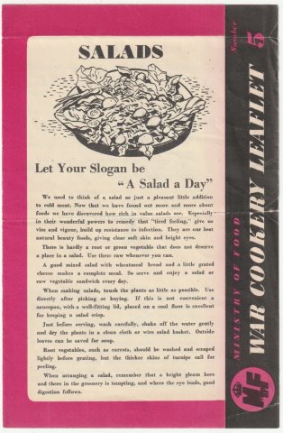 of Food. War Cookery Leaflet No. 5. Salads. c.1944 [16121] Ministry of Food., c. 1943. Advice for seasonal salads with three recipes for dressings. One leaf folded, light wear to front edge else good. £2.50 | |