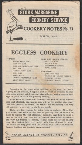 Stork Margarine. Cookery Service Notes No.73. March, 1946. [16129] Margarine Cookery Service, 1946. Eggless Cookery. One leaf folded, with postal address to rear unused, light stains to front else very good. Recipes for many types of cakes, buns and small cakes and puddings. £5.00 | |